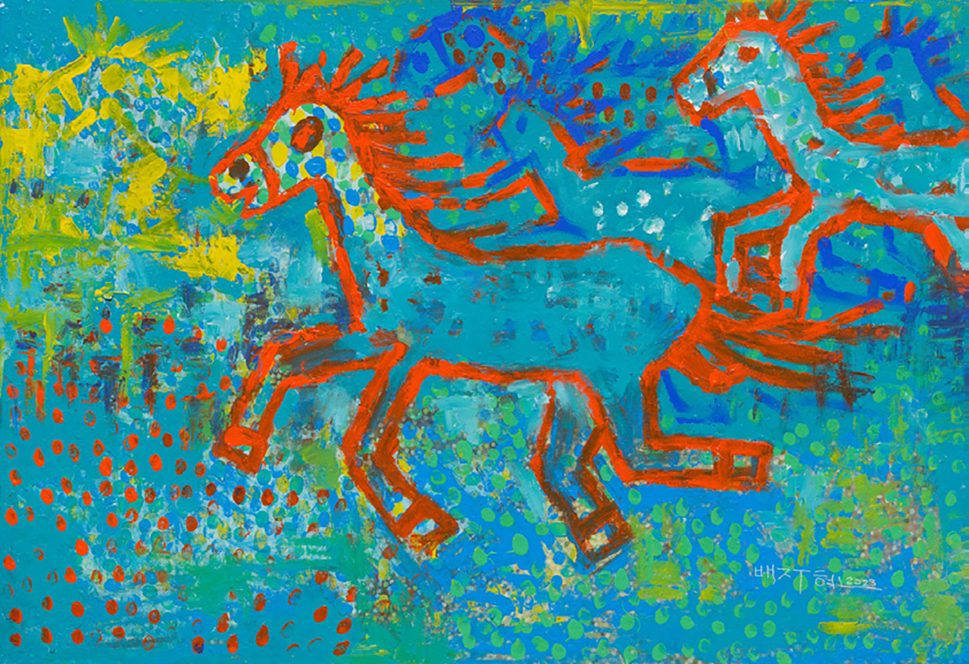 배주현의 작품은 ‘개신’의 힘을 보여준다. 손가락과 손바닥을 활용한 독창적인 기법, 강렬한 색채와 직관적인 형상을 통해 그는 제주마와 해녀, 돌고래 같은 상징들을 자유롭게 그려낸다. 익숙한 풍경을 낯설고도 신선하게 다시 열어젖히는 그의 작업은 고운산의 성찰에서 출발한 질문에 새로운 시각과 감각으로 답하는 듯하다.