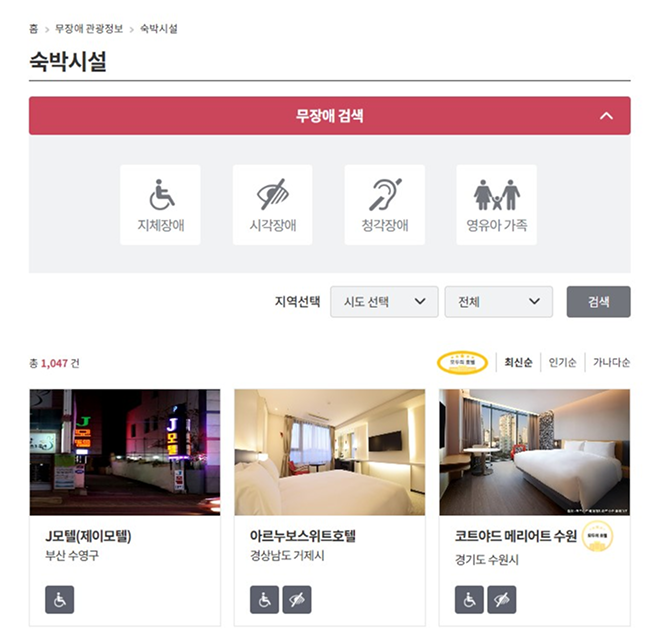 배리어프리 숙소의 정보는 ‘한국관광공사’가 운영하는 ‘열린 관광 플랫폼’에서 확인할 수 있다. 해당 플랫폼은 무장애 관광지를 비롯해 배리어프리 숙소 정보를 제공하며, 장애인뿐 아니라 고령자, 영유아 동반 가족 등 모든 관광객이 이동과 관광 활동에 제약 없이 이용할 수 있는 정보를 지역별로 안내한다. 숙박시설의 접근로, 무장애 객실, 객실 크기, 휠체어 활동 공간, 욕실 출입구 너비 등 실제 이용에 필요한 세부 정보까지 확인 가능하다.